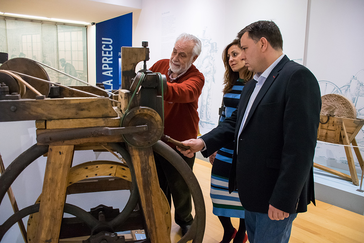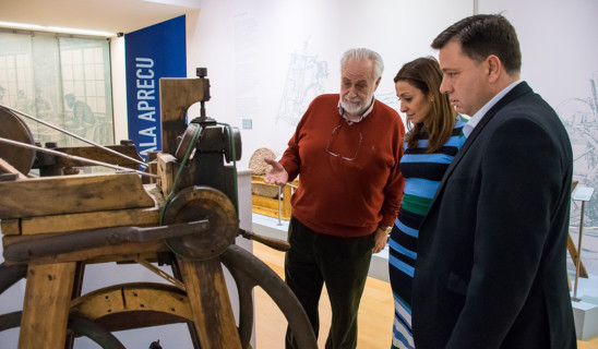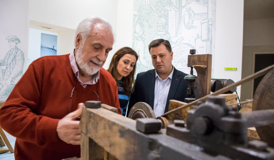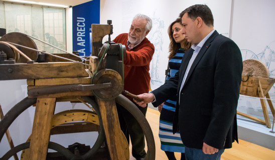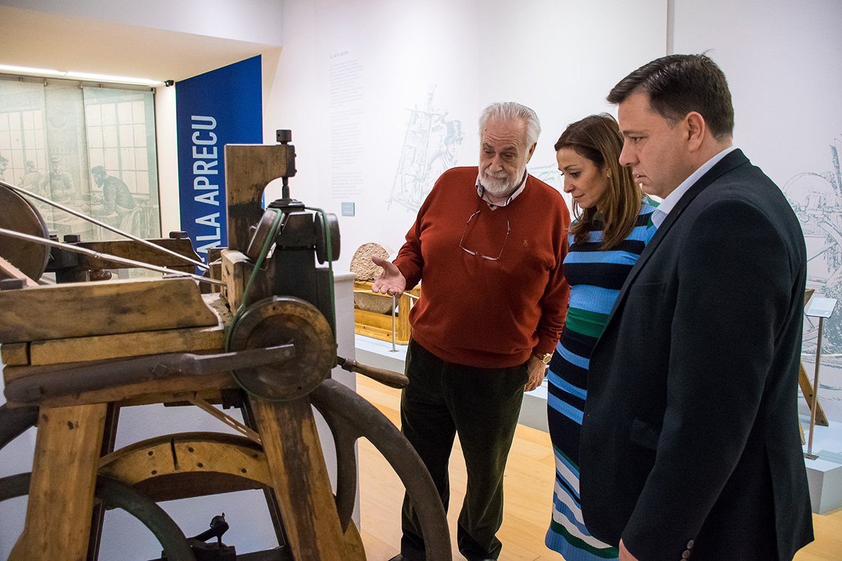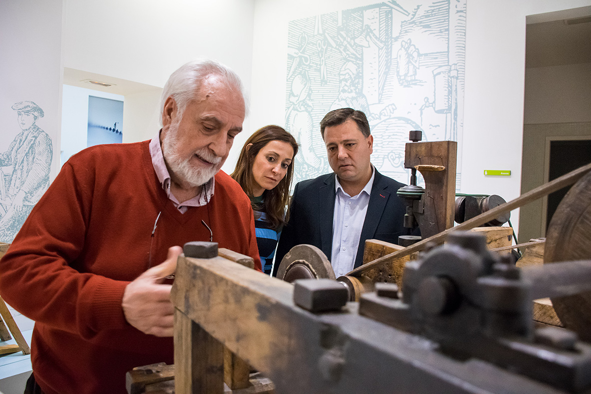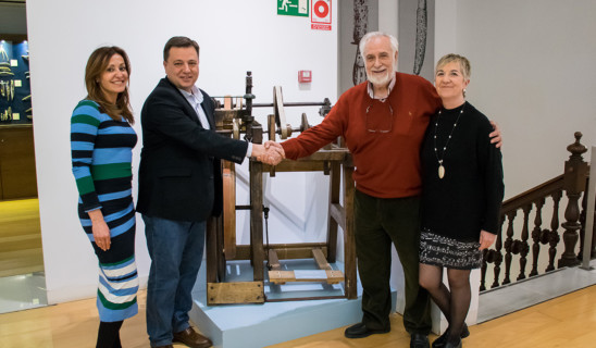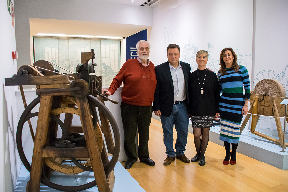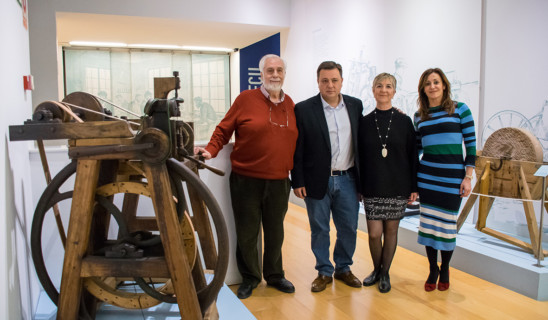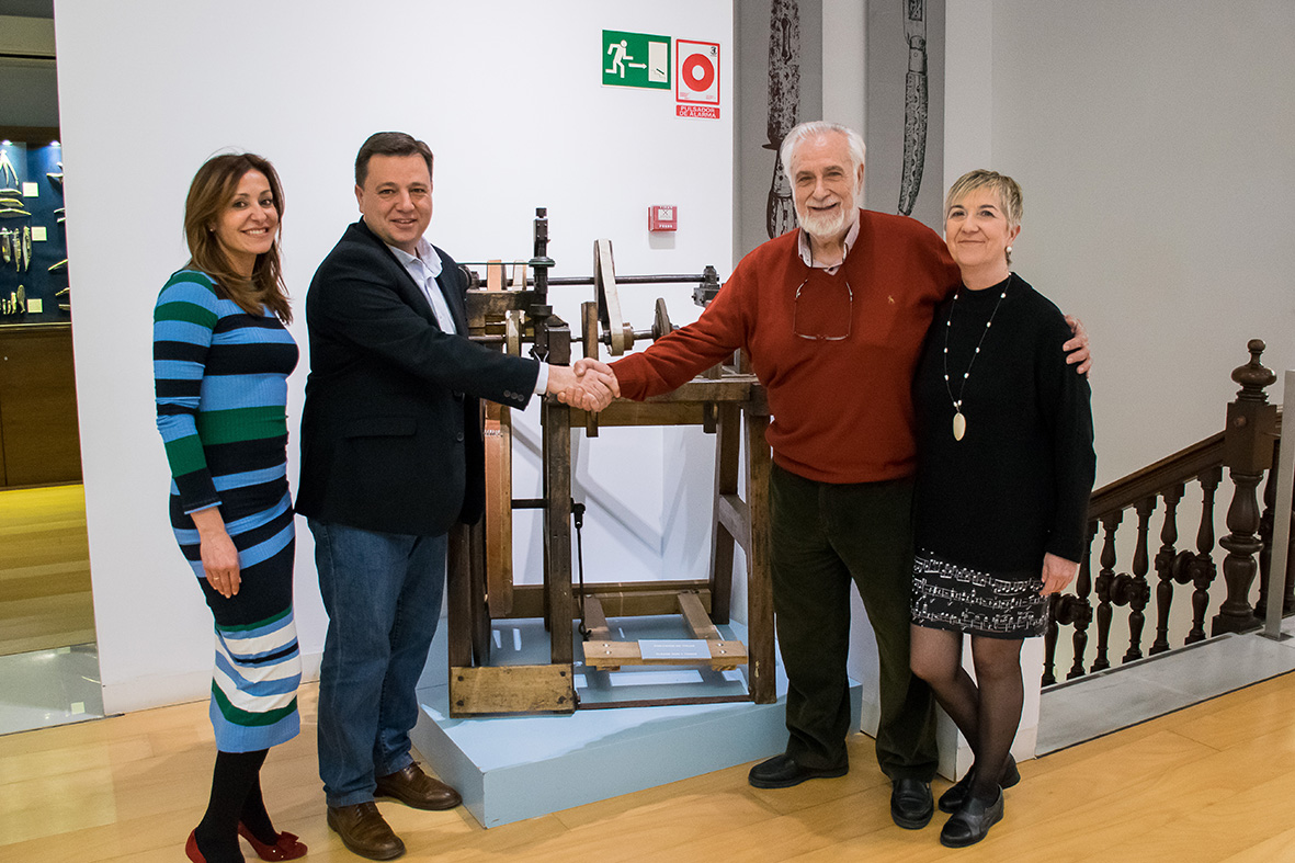 Junto a los útiles y ruedas de los antiguos afiladores se muestra una de las últimas donaciones que el Museo de la Cuchillería ha recibido: una original máquina francesa de pulir, afilar y taladrar compuesta por diferentes elementos y bandas que giran a golpe de un pedal que da movimiento a una gran rueda. El alcalde y presidente del Consorcio del MCA, Manuel Serrano, recibía la donación de Amós Núñez Juan, empresario a quién agradeció su continua colaboración e impagable aportación al Museo Municipal de la Cuchillería.