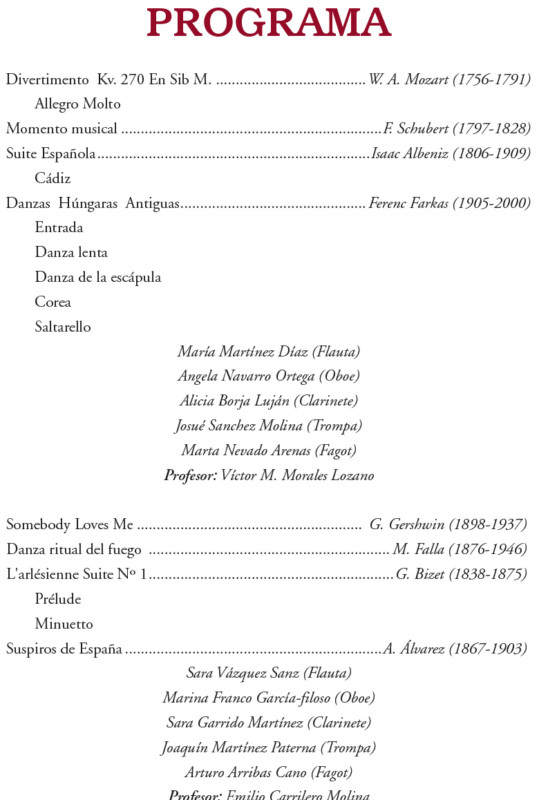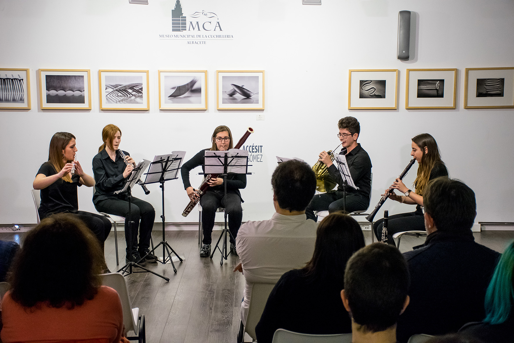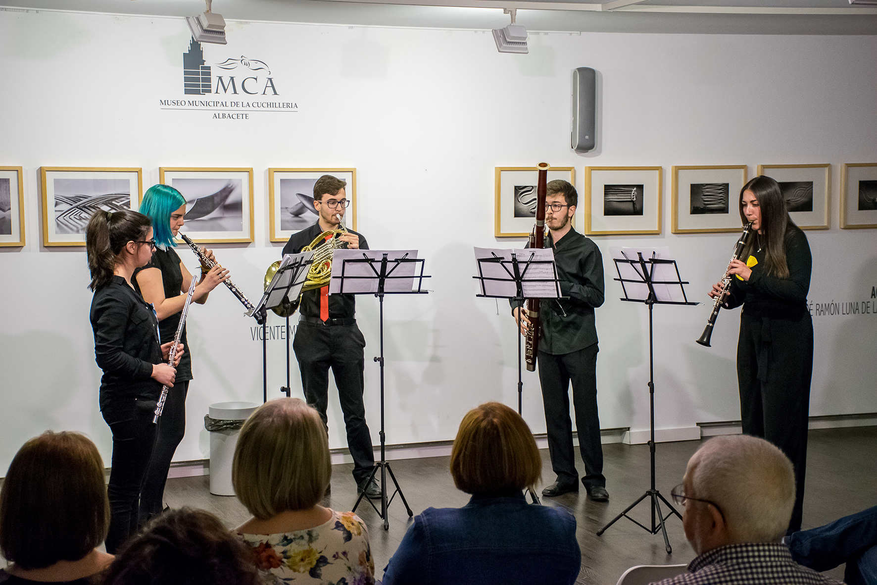 El pasado 18 de abril a las 19:00 horas, con motivo del Día Internacional de los Monumentos y Sitios, el Museo Municipal de la Cuchillería acogió el concierto “Quintetos en el Museo” organizado por el Real Conservatorio Profesional de Música y Danza de Albacete, el cual interpretaron los alumnos del Conservatorio María Martínez Díaz (Flauta), Angela Navarro Ortega (Oboe), Alicia Borja Luján (Clarinete), Josué Sanchez Molina (Trompa) y Marta Nevado Arenas (Fagot). Y por otro lado Sara Vázquez Sanz (Flauta), Marina Franco García-filoso (Oboe), Sara Garrido Martínez (Clarinete), Joaquín Martínez Paterna (Trompa) y Arturo Arribas Cano (Fagot). Los quintetos estuvieron dirigidos por los profesores Victor M. Morales Lozano y Emilio Carrilero Molina.