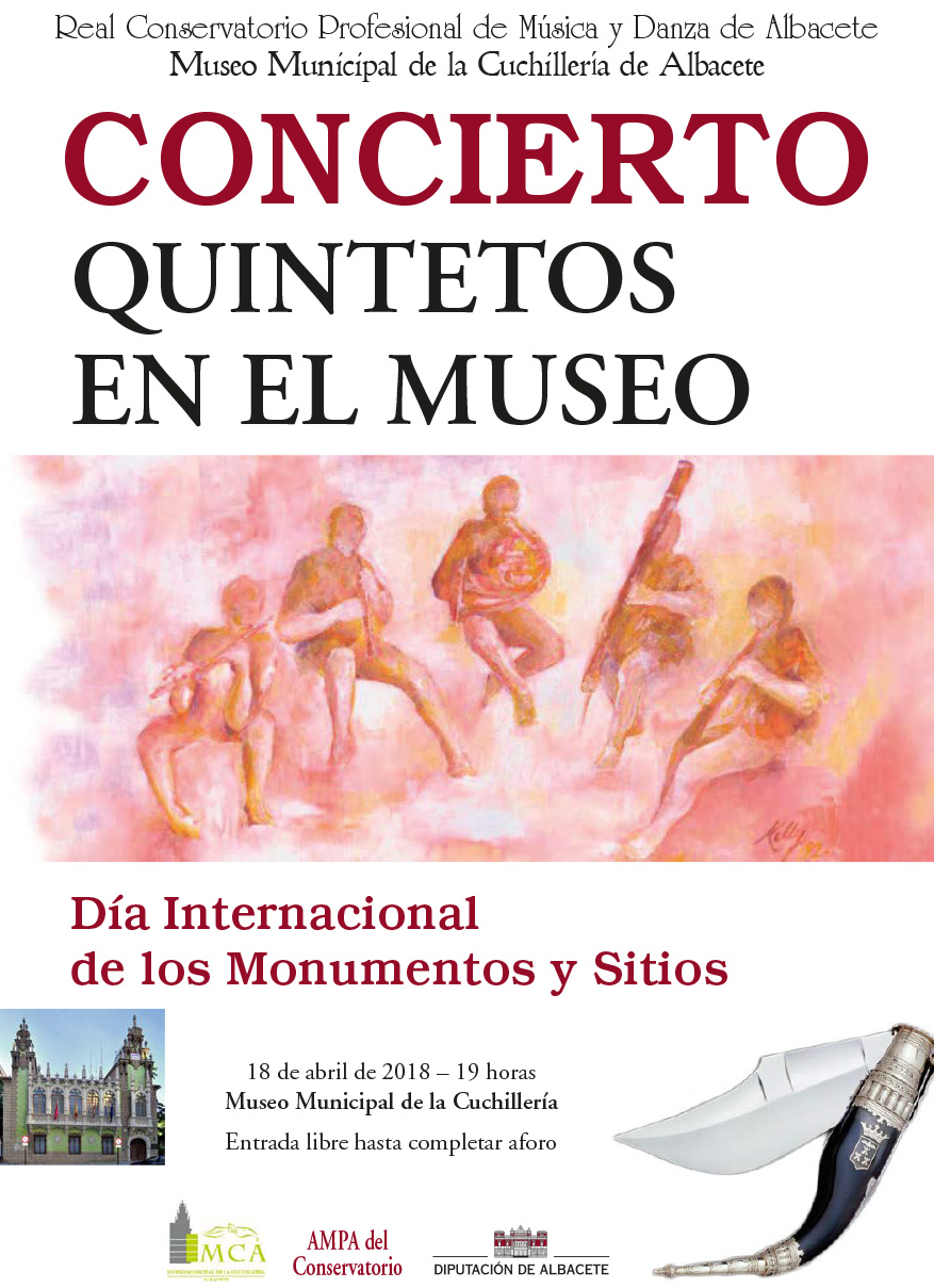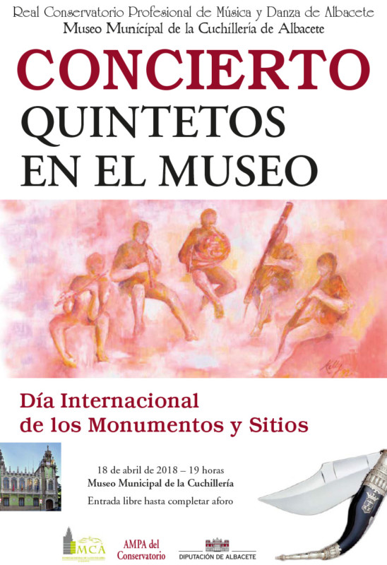 El próximo 18 de abril a las 19:00 horas, con motivo del Día Internacional de los Monumentos y Sitios, el Museo Municipal de la Cuchillería acoge el concierto “Quintetos en el Museo” organizado por el Real Conservatorio Profesional de Música y Danza de Albacete, el cual interpretarán los alumnos del Conservatorio y estarán dirigidos por los profesores Victor M. Morales Lozano y Emilio Carrilero Molina.