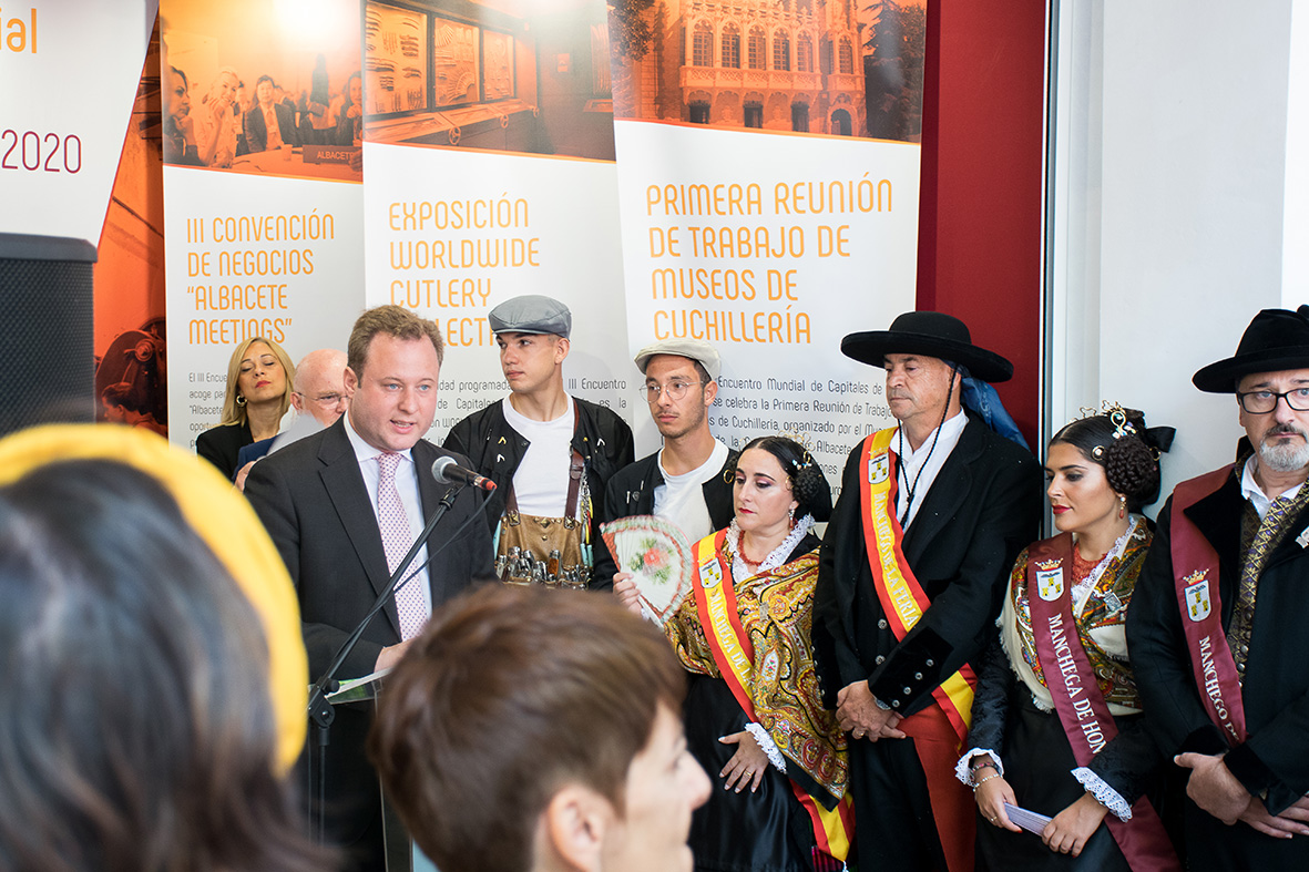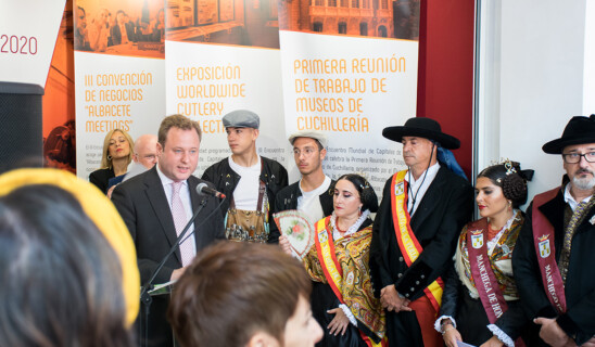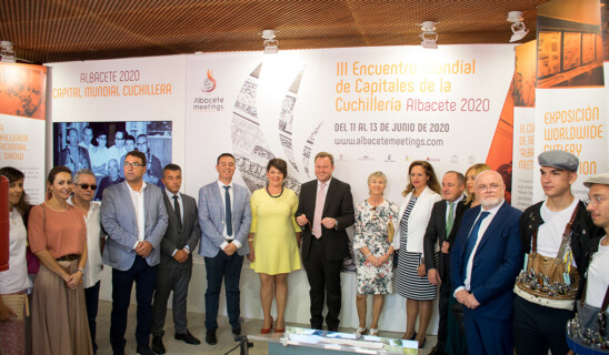 El alcalde de Albacete, Vicente Casañ, junto con la presidenta de la Asociación Provincial de Empresas de la Cuchillería (APRECU), María Pilar Jiménez, inauguraron el stand que promocionará durante la Feria el III Encuentro Mundial de Capitales de la Cuchillería, Albacete 2020, que tendrá lugar del 11 al 13 de junio del próximo año. El alcalde comentó «Feria y cuchillería van de la mano, lo han ido siempre, ahí está esa costumbre de feriarse una navaja, la presencia de los mejores artesanos en el Salón de la Cuchillería desde hace casi cuatro décadas y ahora abrimos un nuevo espacio, este stand, desde el que Albacete trata de proyectarse al exterior».