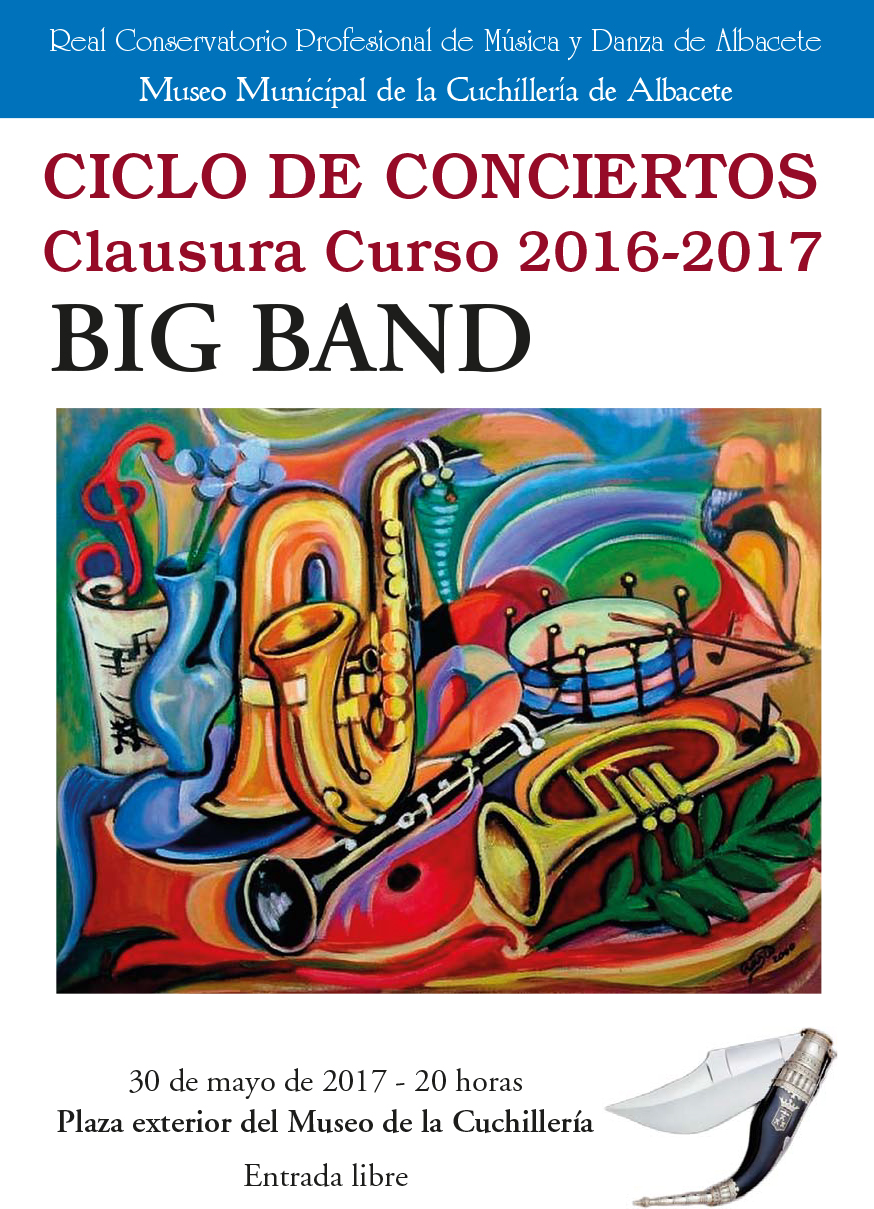 El próximo día 30 de mayo, a las 20:00 horas, se celebrará en la plaza exterior del Museo de la Cuchillería un concierto de la “Big Band” del Real Conservatorio de Albacete, con motivo del ciclo de conciertos por la clausura del curso 2016-2017.