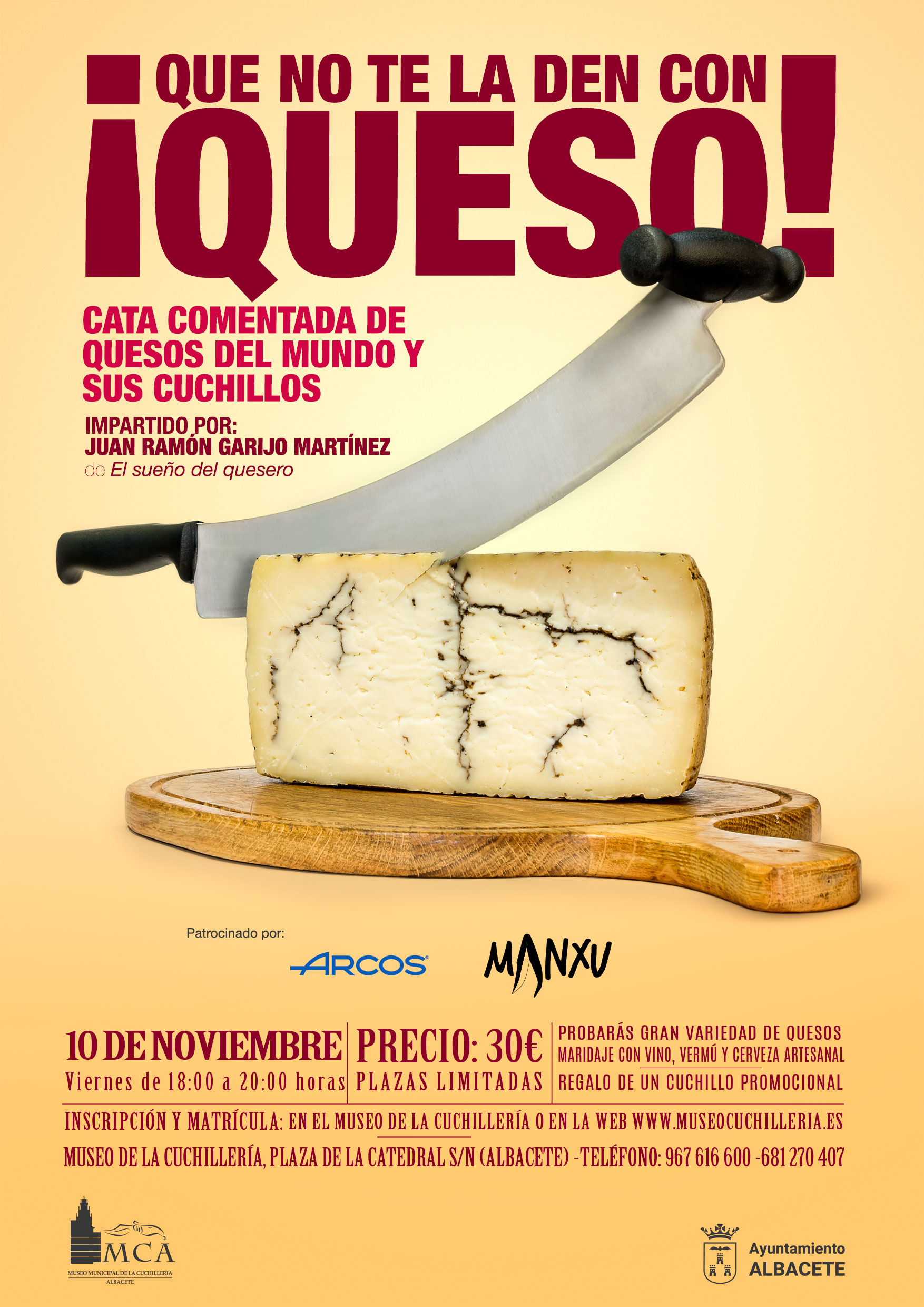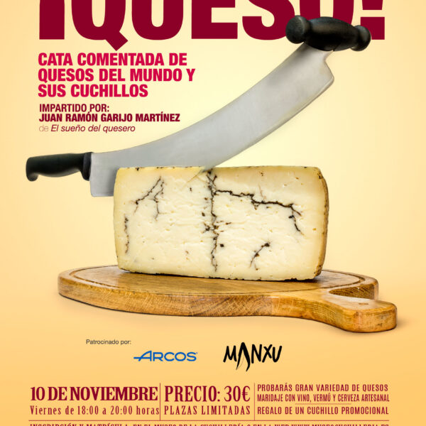 Por fin tenemos una CATA COMENTADA DE QUESOS DEL MUNDO Y SUS CUCHILLOS. De la mano de Juan Ramón Garijo Martínez de El sueño del quesero, conoceremos algunas variedades, de lo más curiosas, de quesos que existen en el mundo. Además se podrán ver los diferentes cuchillos que se utilizan para su corte, así como la diversidad de útiles que hay para cortar cada tipo de queso.