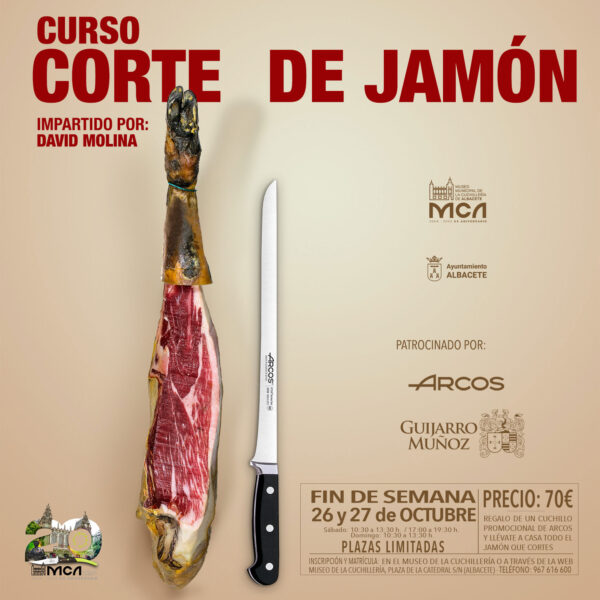 El Museo Municipal de la Cuchillería oferta un nuevo curso dedicado al corte de jamón. En él se impartirán nociones teóricas básicas e imprescindibles a la hora de cortar y emplatar un jamón, para pasar a continuación a la práctica -habrá un jamón por cada tres alumnos-.