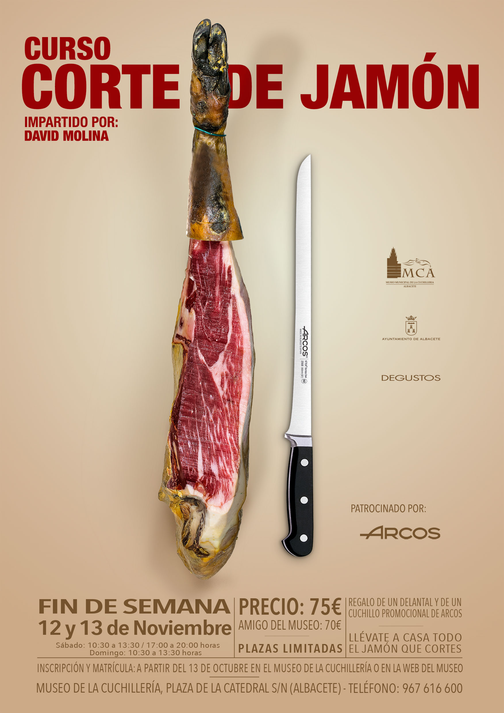 El Museo Municipal de la Cuchillería oferta un nuevo curso dedicado al corte de jamón. En él se impartirán nociones teóricas básicas e imprescindibles a la hora de cortar y emplatar un jamón, para pasar a continuación a la práctica -habrá un jamón por cada tres alumnos-.